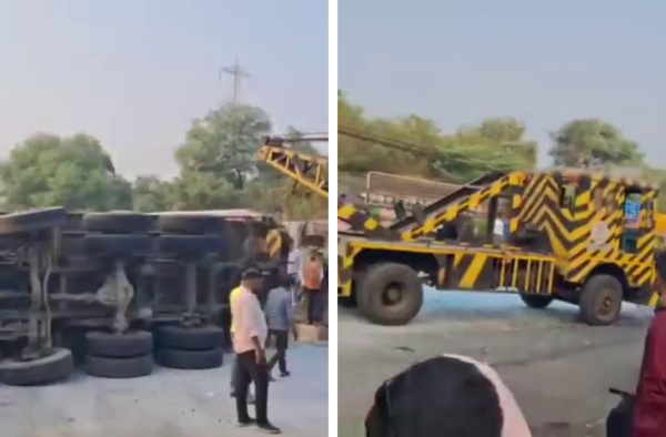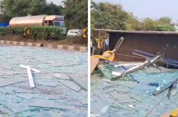- ઢળતી બપોરે ચાર વાગે પોઇચા બ્રિજ ક્રોસ કર્યા બાદ આ ટ્રકના આગળના બે ટાયર ફેઇલ થતા ટ્રક અચાનક પલટી મારતા આખા રોડ પર કાચ..કાચ.. થઇ ગયા હતા