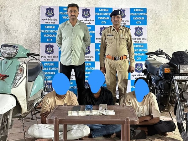 ત્રણ આરોપીઓ તુષાર ઉર્ફે મીનુ કાંતિભાઈ યુનારા, (રહે. રમેશચંદ્રની ગલી, બરાનપુરા પેટ્રોલપંપ સામે, બરાનપુરા વાડી, વડોદરા) આશિષ ઉર્ફે રૂત્વિક કમલેશભાઈ ચુનારા, (રહે. વિઠ્ઠલવાડી, ચોખંડીનાની શાક માર્કેટ પાસે, વાડી, વડોદરા) અને હર્ષ ઉર્ફે બમ્બુ નયનભાઈ ચુનારા, (રહે. રમેશચંદ્રની ગલીની બાજુમાં, બરાનપુરા પેટ્રોલપંપ સામે, બરાનપુરાવાડી, વડોદરા)ને ઝડપી પાડ્યા હતા. જ્યારે કાયદાના સંઘર્ષમાં આવેલ ફરાર સગીર આરોપીની શોધખોળ હાથ ધરી છે. પોલીસે આરોપીઓ પાસેથી બાઈક, મોપેડ, રોકડ 20,000 રૂપિયા, 3 મોબાઇલ સહિતનો મુદ્દામાલ જપ્તે કર્યો હતો.