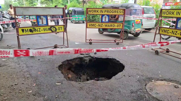 વડોદરા શહેરના કારેલીબાગ-પાણીની ટાંકી વિસ્તારના કોમર્શિયલ ગણાતા હાથી ખાના તરફ જવાના રસ્તે ચાર રસ્તા નજીક જ મસમોટો ભુવો પડ્યો છે. નજીકમાં જ રોજ સાંજે શાકમાર્કેટ ભરાય છે ત્યારે માત્ર પાલિકા તંત્ર એ ચારે બાજુએ બેરીકેટ મૂકીને સંતોષ માન્યો છે. આ જગ્યાએ તાજેતરમાં જ પાલિકા દ્વારા ખોદકામ કરવામાં આવ્યું હતું. થાગડ થીગડ કરીને જેમ તેમ પુરાણ બાદ ડામર કપચી નાખીને રોલર ફેરવી દેવાયુ હોવાનું સ્પષ્ટ નજરે ચડે છે. આ ભુવામાં કેટલીય પાણીની અને ડ્રેનેજની લાઈનો આવેલી છે જે લીકેજ થતા કારેલીબાગ વિસ્તારમાં રોગચાળો ફાટી નીકળે તો નવાઈ નહીં.