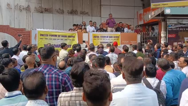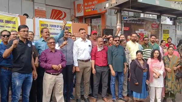- યુનાઈટેડ ફોરમ ઓફ બેંક યુનિયન્સના નેજા હેઠળ બેંક ઓફ બરોડા ખાતે સૂત્રોચ્ચાર, ઓફલાઈન સેવાઓ અને કરોડો રૂપિયાના ચેક ક્લિયરન્સ પર અસર