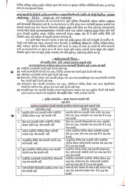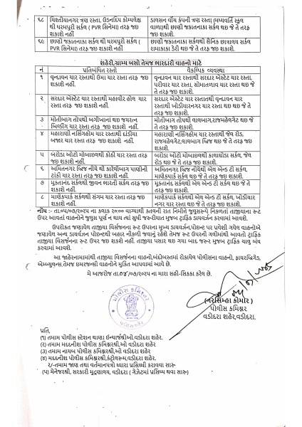જાહેર જનતાને આ દરમિયાન કોઈ પણ પ્રકારની અગવડ ન થાય અને ટ્રાફિક સુચારૂ રીતે ચાલે તે હેતુથી વડોદરા શહેર પોલીસ કમિશ્નર નરસિમ્હા કોમાર દ્વારા જાહેરનામું પ્રસિદ્ધ કરવામાં આવ્યું છે. જેમાં આગામી તા. 6 જુલાઈના 12 વાગ્યાથી 24 કલાક સુધી અથવા ઝુલુસ અને તાજીયા વિસર્જન પૂર્ણ ન થાય ત્યાં સુધી ટ્રાફિક વ્યવસ્થા અંગે જાહેરનામું જારી કરવાની આવ્યું છે.